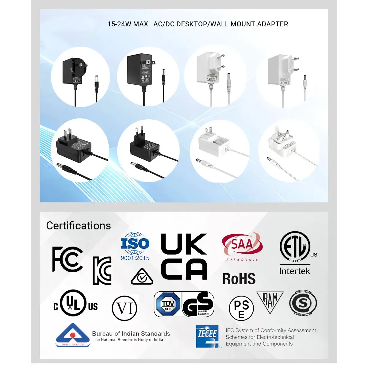 24W पावर एडॉप्टर श्रृंखला कड़े अंतरराष्ट्रीय मानकों को पूरा करती है और सुरक्षा और पर्यावरण अनुपालन सुनिश्चित करने के लिए CE/FCC/UL/RCM/SAA/UKCE/KC/BIS/PSE प्रमाणपत्र सहित वैश्विक प्रमाणपत्रों का दावा करती है। इसका यूरोपीय प्लग डिज़ाइन सुरक्षित कनेक्शन की अनुमति देता है, जिससे विभिन्न सेटिंग्स में इसका उपयोग करना आसान हो जाता है।
