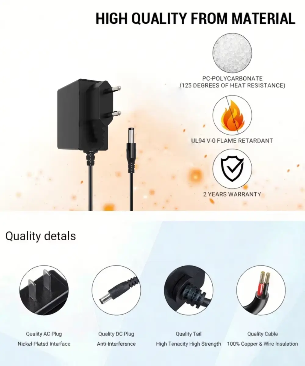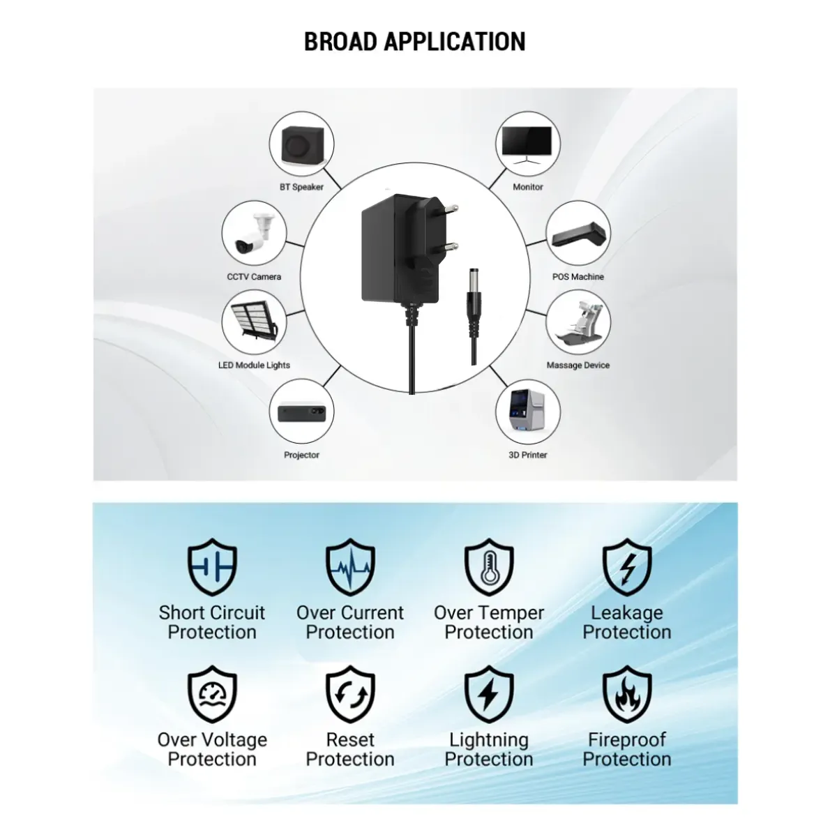 1. व्यापक सुरक्षा आश्वासन: ओवर-करंट, ओवर-वोल्टेज, शॉर्ट-सर्किट और ओवर-टेम्परेचर सुरक्षा सहित कई सुरक्षा से लैस, यह एडाप्टर स्वयं और आपके जुड़े उपकरण दोनों को विद्युत दोषों से सुरक्षित रखता है।