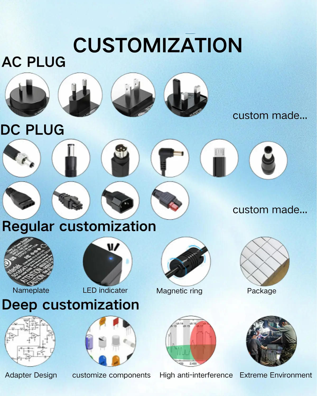 हम एसी/डीसी बिजली आपूर्ति कारखाने हैं जो किसी भी पावर एडाप्टर को अनुकूलित कर सकते हैं और प्रासंगिक प्रमाणपत्र पास कर सकते हैं।