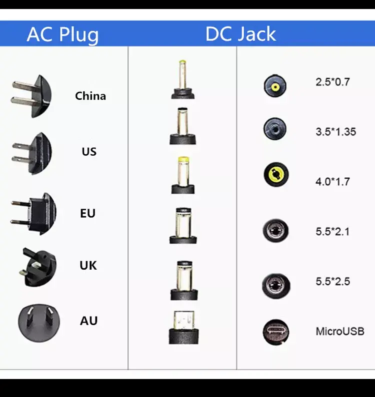कनेक्टर प्रकार: मानक डीसी बैरल कनेक्टर (सामान्य आकार में 5.5 मिमी × 2.1 मिमी या 5.5 मिमी × 2.5 मिमी शामिल हैं, डिवाइस आवश्यकताओं के आधार पर अनुकूलन योग्य)।
