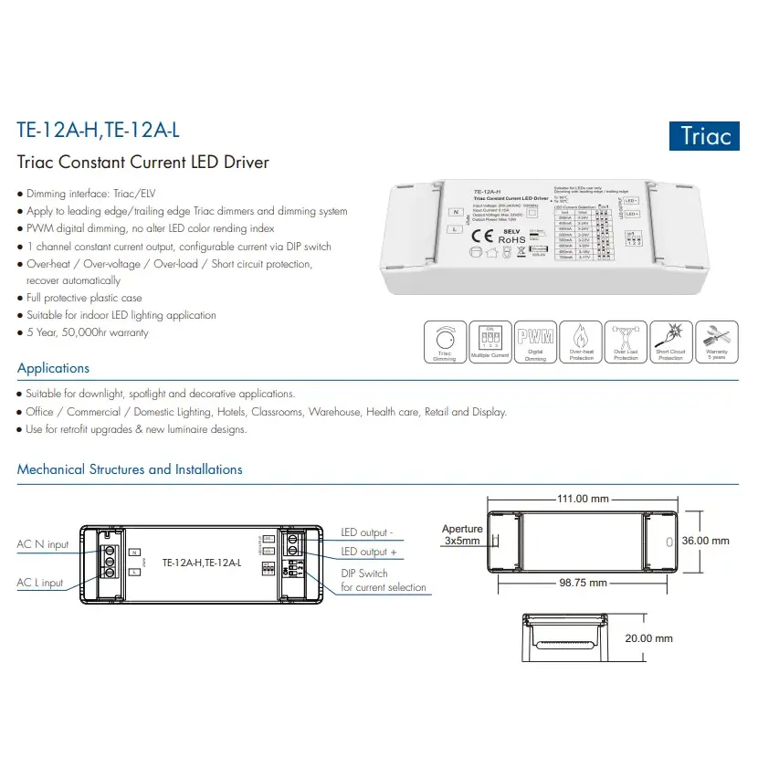 छोटे आकार का 12W कॉन्स्टेंट करंट ट्राइक डिमेबल एलईडी ड्राइवर