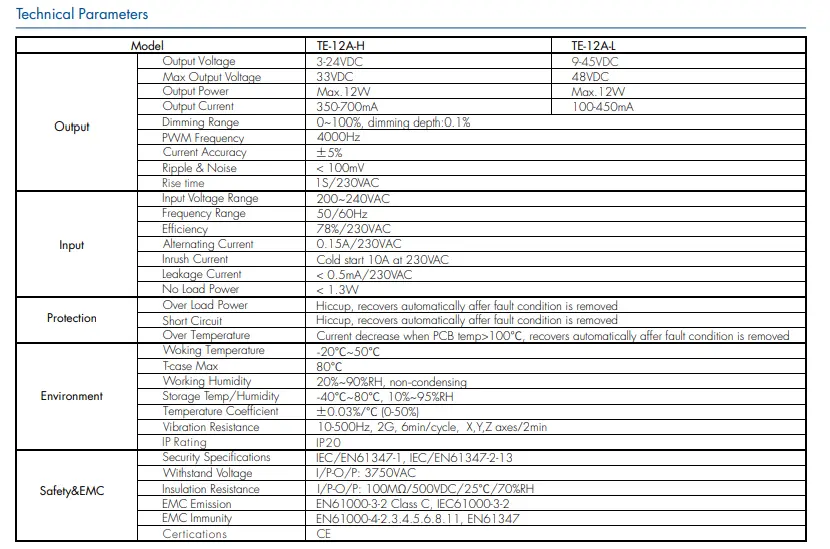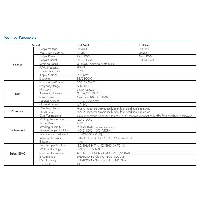 इनपुट वोल्टेज: 200-240VAC 50-60Hz इनपुट करंट:0.15A आउटपुट पावर: 12 वाट अधिकतम आउटपुट वोल्टेज :9~42V वारंटी: 2 वर्ष प्रमाणपत्र: सीई/रोह्स