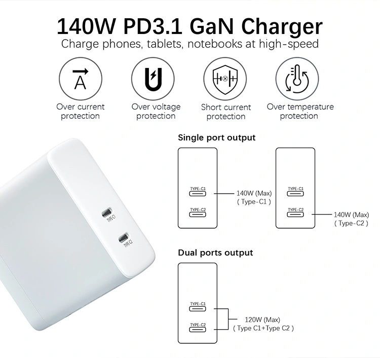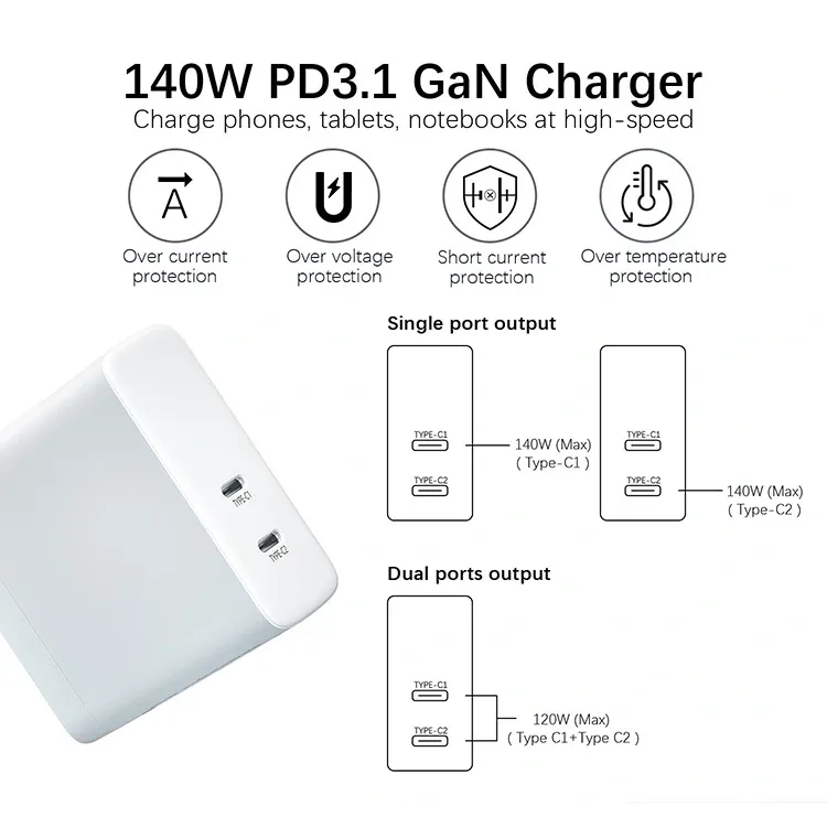 140W डुअल यूएसबी सी पोर्ट पीडी चार्जर यूएस प्लग फोल्डेबल: सिंगल पोर्ट 140W तक पावर प्रदान कर सकता है। दोहरे पोर्ट आउटपुट पावर को बुद्धिमानी से एक साथ आवंटित किया जाता है। एक ही समय में लैपटॉप और मोबाइल फोन चार्ज करने पर दक्षता अपरिवर्तित रहती है।
