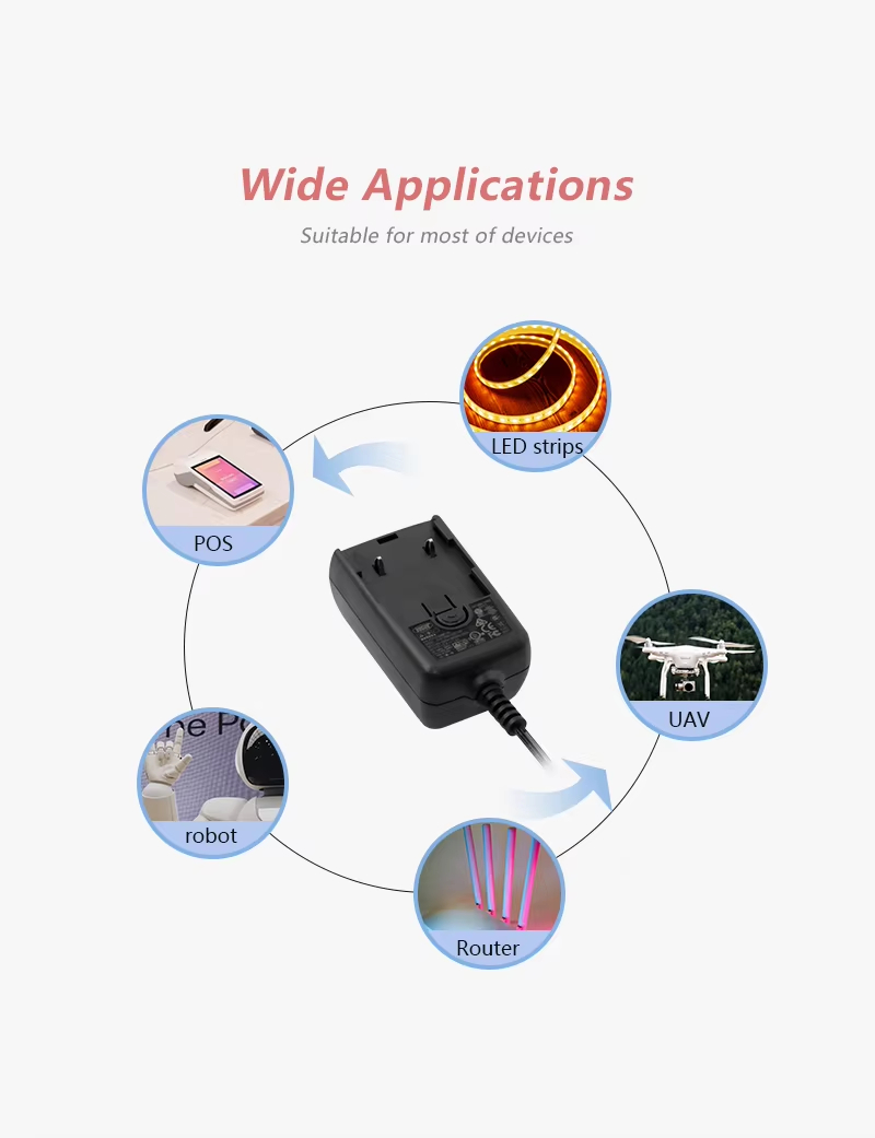 अनुप्रयोग परिदृश्यों की विस्तृत श्रृंखला: चाहे वह एलईडी लाइट स्ट्रिप्स, स्मार्ट स्पीकर, नेटवर्क राउटर, या अन्य छोटे विद्युत उपकरणों को बिजली देने के लिए हो, यह शक्तिशाली स्विचिंग इंटरचेंजेबल प्लग बिजली आपूर्ति आपकी सबसे आदर्श और आश्वस्त करने वाली पसंद है!