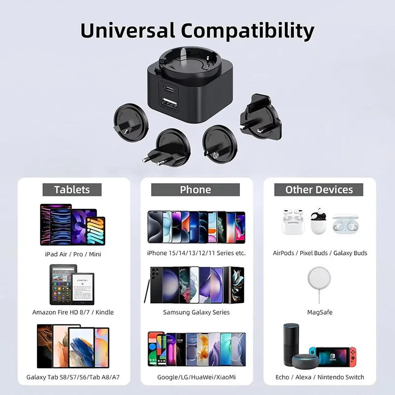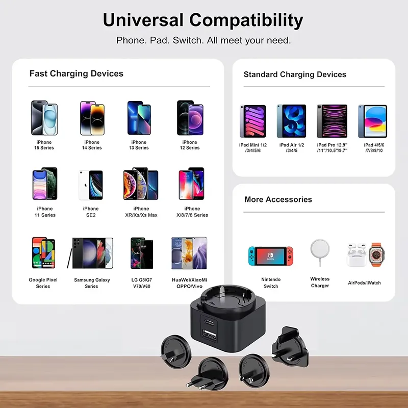 बहुमुखी प्रतिभा प्रमुख है. डुअल-पोर्ट डिज़ाइन (यूएसबी-सी/यूएसबी-ए) आपको एक साथ दो डिवाइस चार्ज करने की अनुमति देता है। 30W इंटरचेंजेबल प्लग पीडी चार्जर में इंटरचेंजेबल प्लग (यूएस/ईयू/यूके/एयू) का एक सेट है, जो इसे दुनिया भर में आपका आदर्श यात्रा साथी बनाता है। चाहे आप स्मार्टफोन, टैबलेट या लैपटॉप चार्ज कर रहे हों, सार्वभौमिक अनुकूलता शीर्ष स्तरीय प्रदर्शन सुनिश्चित करती है।