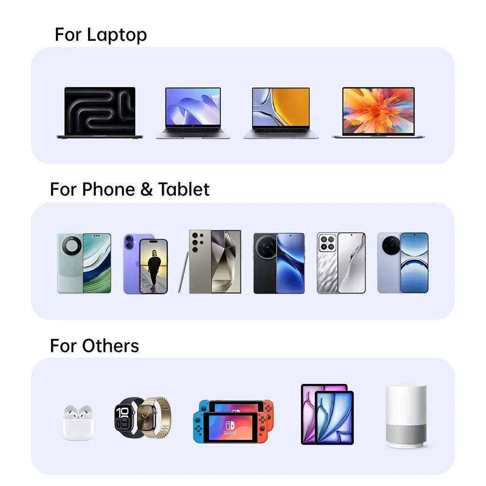 मोबाइल फोन, हेडफोन और गेमिंग एक्सेसरीज सहित यूएसबी-सी उपकरणों के साथ संगत। सुरक्षित और कुशल चार्जिंग के लिए डिवाइस की आवश्यकताओं का स्वचालित रूप से पता लगाता है। 4.यात्रा के लिए तैयार पोर्टेबिलिटी