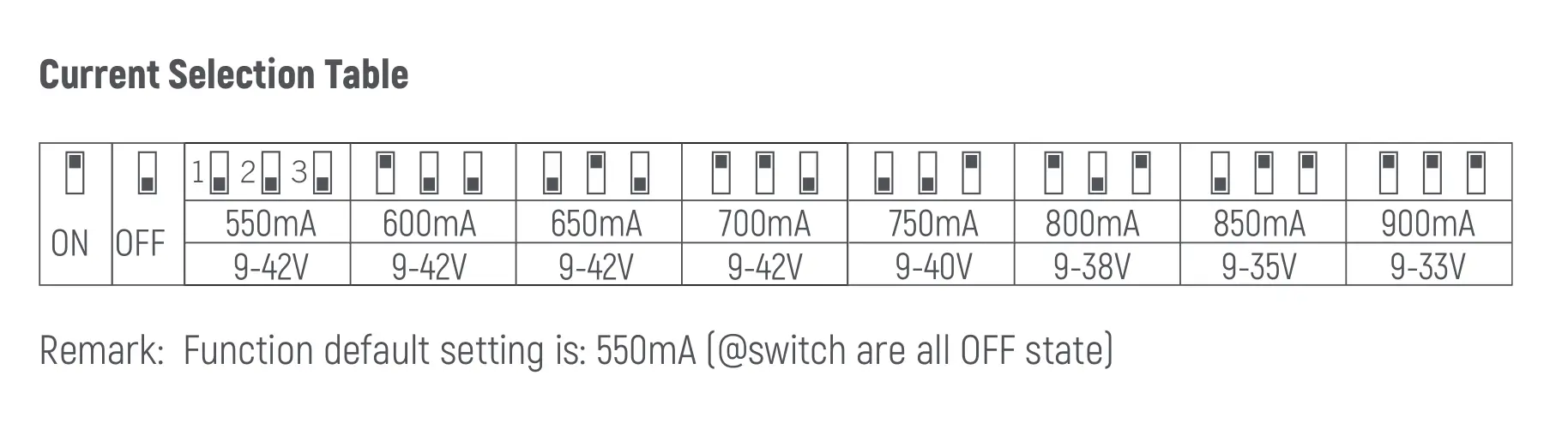 आउटपुट करंट: समायोज्य, विवरण के लिए वर्तमान चयन तालिका देखें