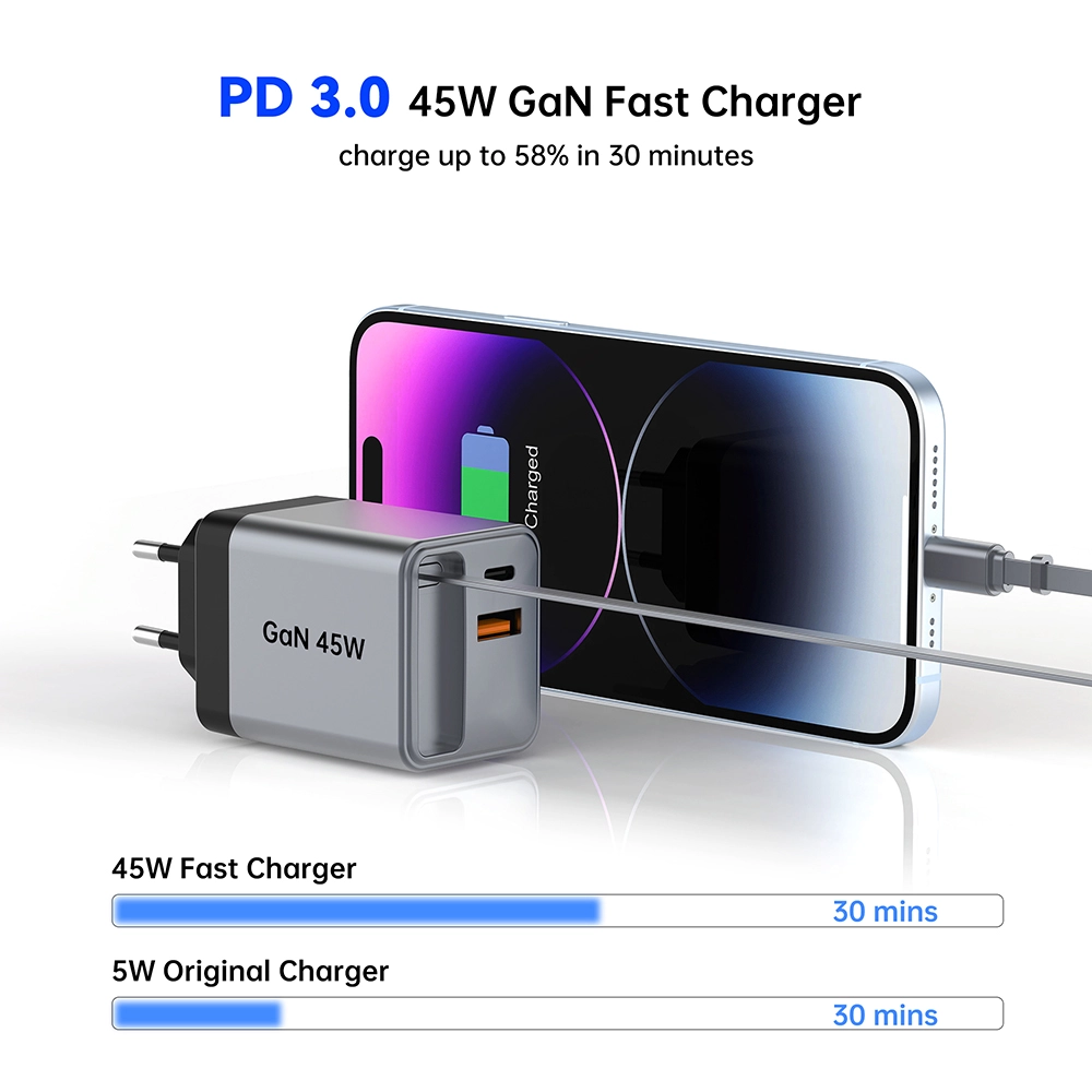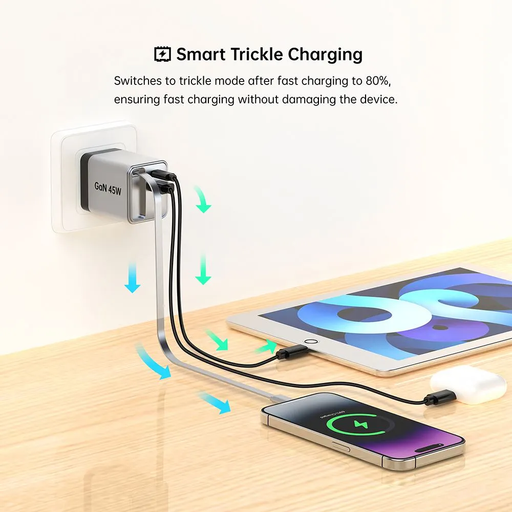 हाई-स्पीड चार्जिंग: GAN 45W रिट्रैक्टेबल फास्ट चार्जर 45 वाट का शक्तिशाली आउटपुट देता है, जो आपके डिवाइस के लिए तेज़ चार्जिंग सुनिश्चित करता है।