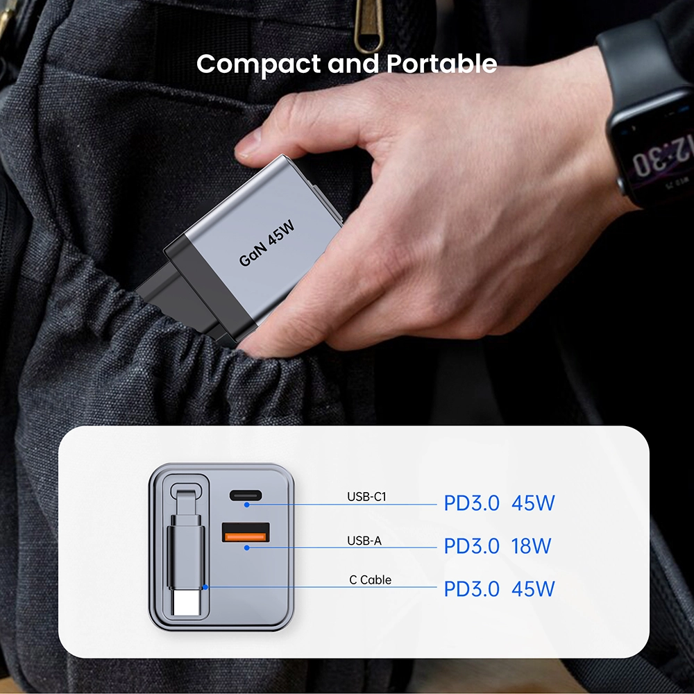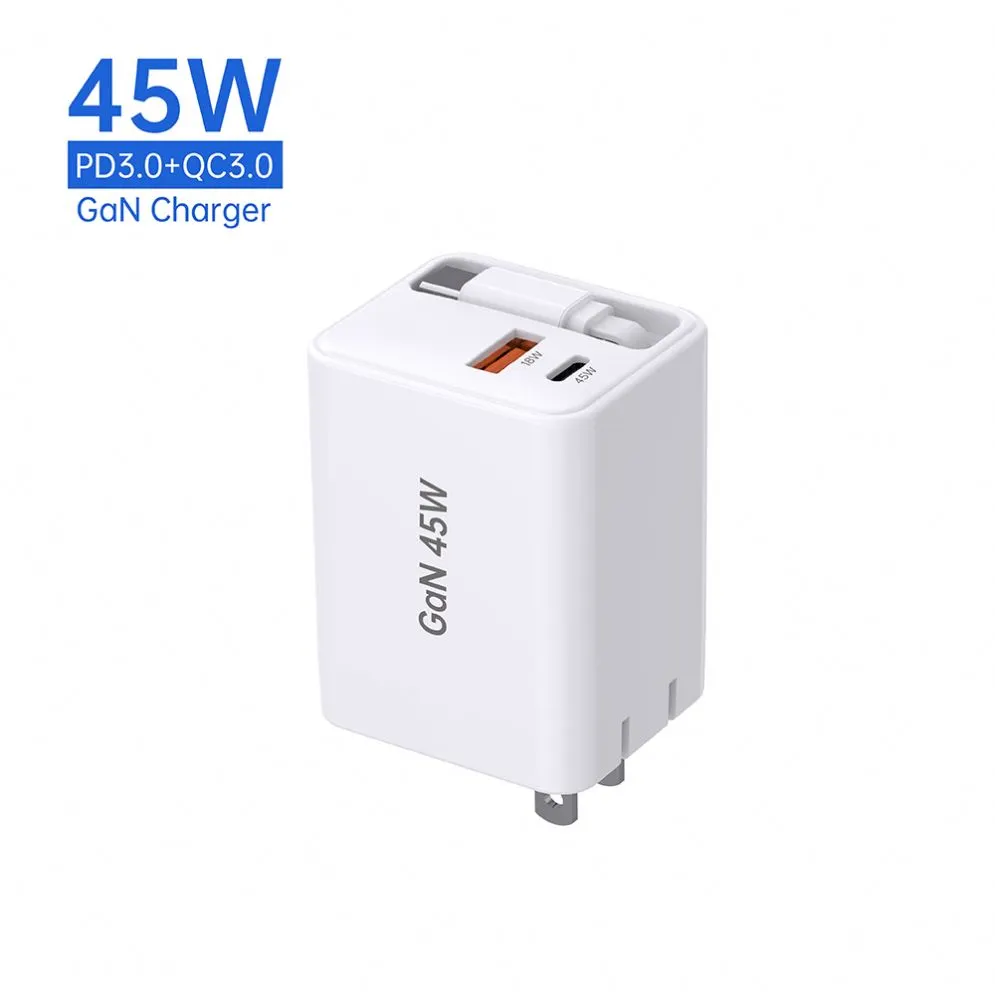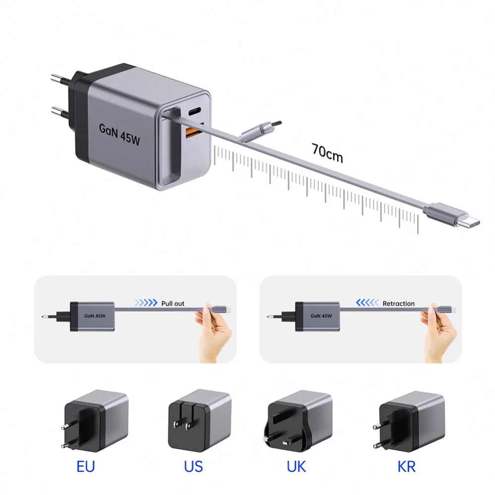 GAN 45W रिट्रैक्टेबल फास्ट चार्जर USB-केबल+USB-A+USB-C 45W PD चार्जर केबल के साथ