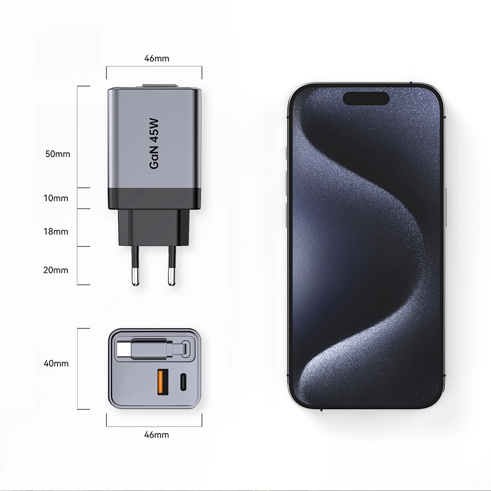 45W ईयू एसी प्लग पीडी चार्जर, रिट्रैक्टेबल टाइप सी केबल के साथ |