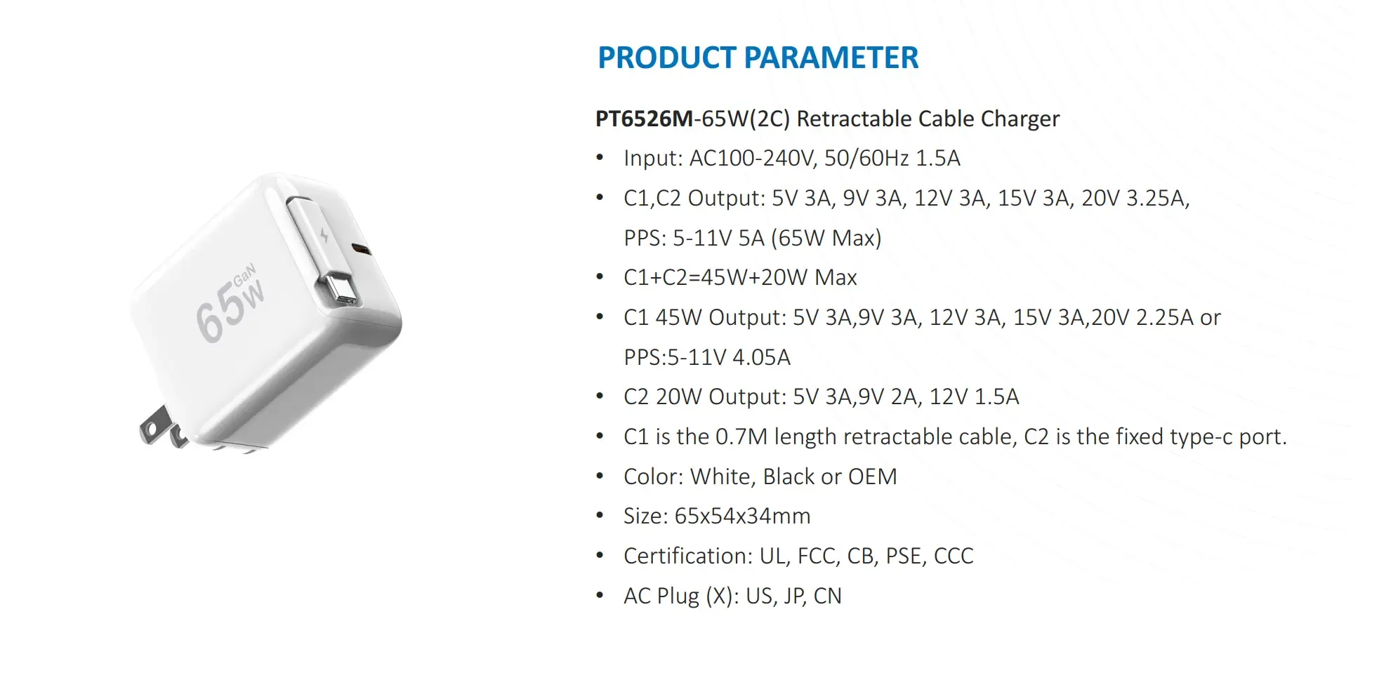 ट्रैक्टेबल यूएसबी सी केबल के साथ 65W पीडी चार्जर विशिष्टता: