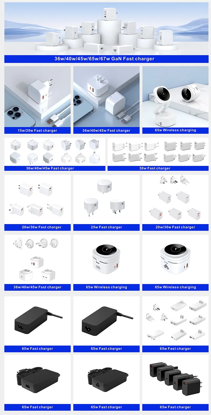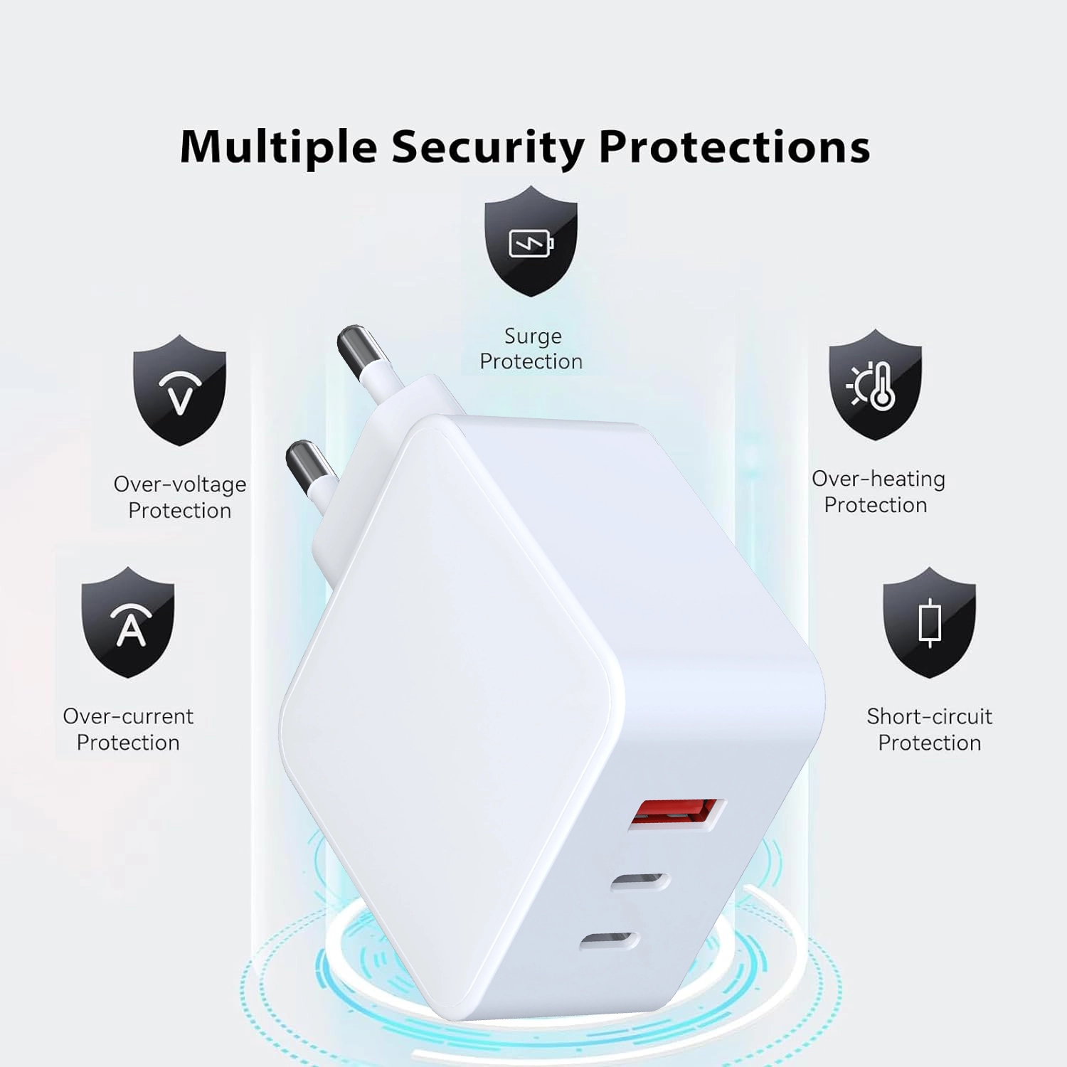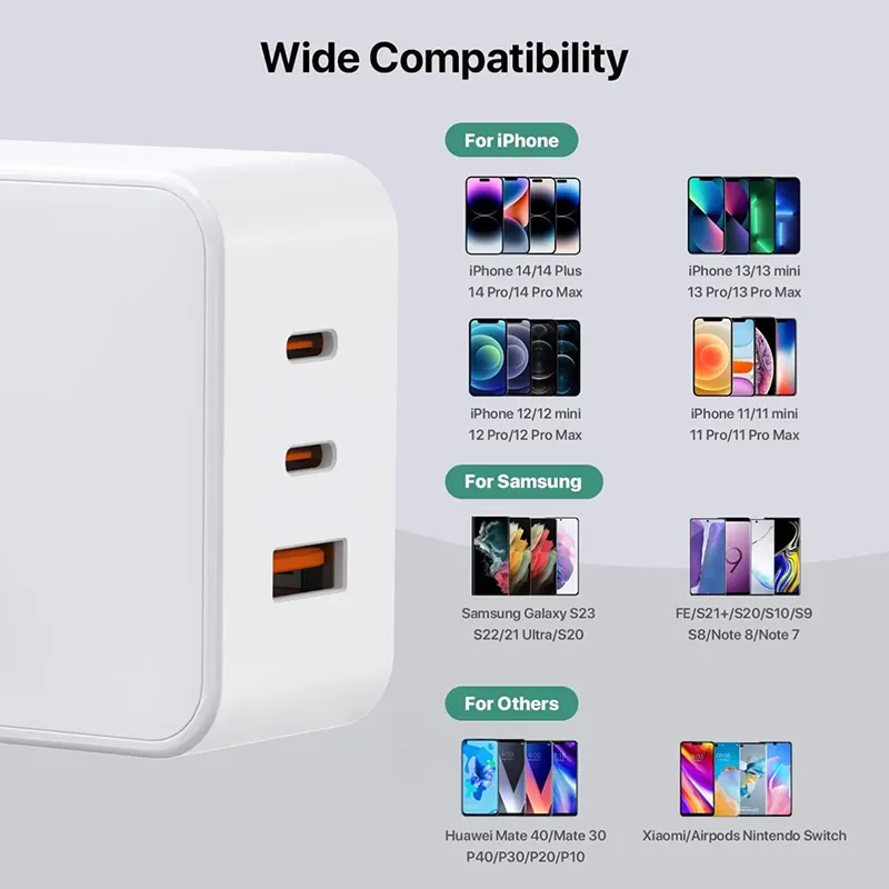 यह चार्जर 65W तक लगातार बिजली प्रदान करता है और लैपटॉप (जैसे मैकबुक एयर/प्रो, डेल एक्सपीएस), टैबलेट, स्मार्टफोन (आईफोन, सैमसंग गैलेक्सी) और पीडी प्रोटोकॉल का समर्थन करने वाले अन्य उपकरणों को कुशलतापूर्वक चार्ज करता है। इसका कॉम्पैक्ट और हल्का डिज़ाइन इसे यात्रा के लिए आदर्श बनाता है, जबकि अंतर्निहित ओवरवॉल्टेज, ओवरकरंट और शॉर्ट-सर्किट सुरक्षा चार्जर और कनेक्टेड डिवाइसों की सुरक्षित चार्जिंग सुनिश्चित करती है। यह आमतौर पर 1-2 यूएसबी-सी इंटरफेस से लैस होता है, जो शक्ति और सुविधा को संतुलित करते हुए एक ही समय में कई छोटे उपकरणों को चार्ज करने का समर्थन करता है।